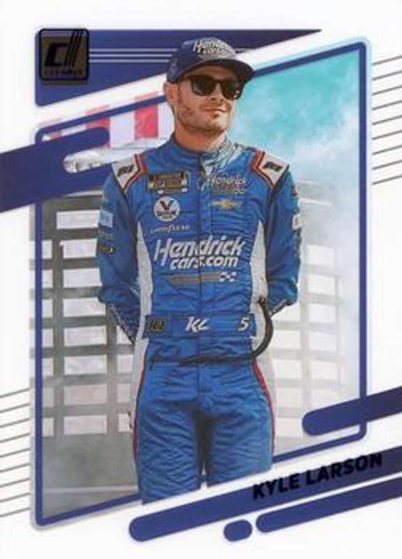 The Kyle Larson 2022 Chronicles NASCAR #10 Clearly Donruss Blue /50 card is 1 of 164 Kyle Larson's card variations in the 2022 Chronicles NASCAR set being tracked by Sports Card Investor, including Black, Black Autographs, Black Green, Clearly Donruss, and Clear Vision.