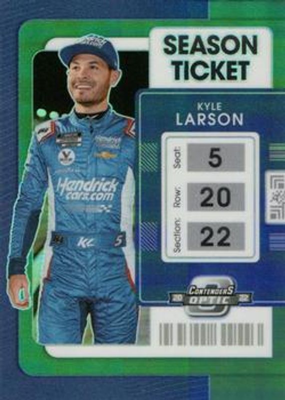 The Kyle Larson 2022 Chronicles NASCAR #15 Contenders Optic Green card is 1 of 164 Kyle Larson's card variations in the 2022 Chronicles NASCAR set being tracked by Sports Card Investor, including Black, Black Autographs, Black Green, Clearly Donruss, and Clear Vision.