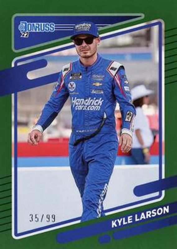 The Kyle Larson 2022 Donruss NASCAR #69 Green /99 card is 1 of 137 Kyle Larson's card variations in the 2022 Donruss NASCAR set being tracked by Sports Card Investor, including #50 Base, #140 Base, #20 Base, #69 Base, and #50 Carolina Blue.