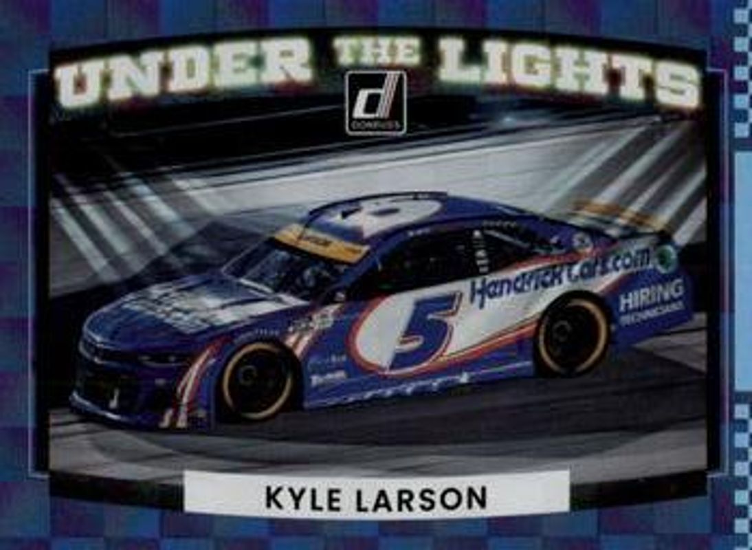 The Kyle Larson 2022 Donruss NASCAR #UL3 Under The Lights Checkers card is 1 of 137 Kyle Larson's card variations in the 2022 Donruss NASCAR set being tracked by Sports Card Investor, including #50 Base, #140 Base, #20 Base, #69 Base, and #50 Carolina Blue.