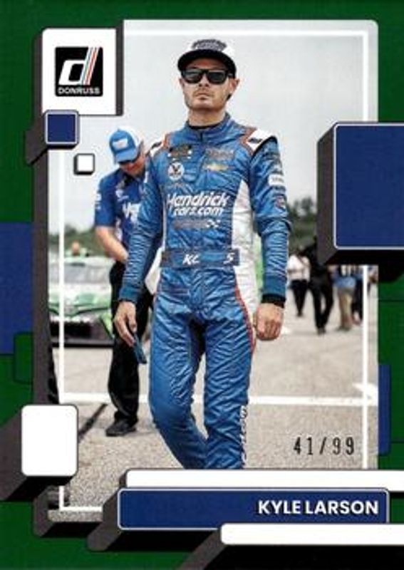 The Kyle Larson 2023 Donruss NASCAR #45 Green /99 card is 1 of 157 Kyle Larson's card variations in the 2023 Donruss NASCAR set being tracked by Sports Card Investor, including #5 Base, #117 Base, #129 Base, #45 Base, and #117 Carolina Blue.
