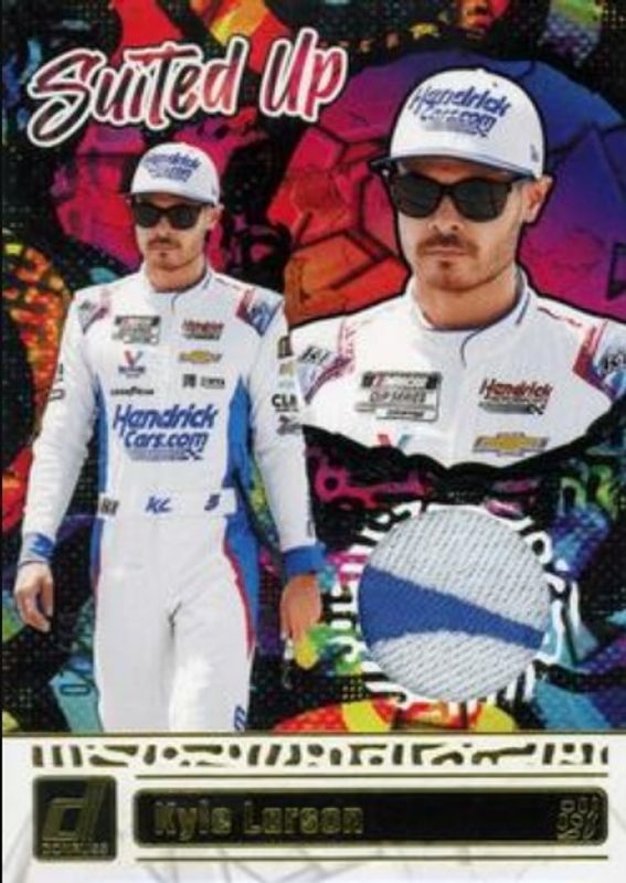 The Kyle Larson 2024 Donruss NASCAR #SU-KL Suited Up Swatches - Gold /10 card is 1 of 117 Kyle Larson's card variations in the 2024 Donruss NASCAR set being tracked by Sports Card Investor, including #26a Base, #26b Base, #85 Base, #26 Optic, and #85 Optic.
