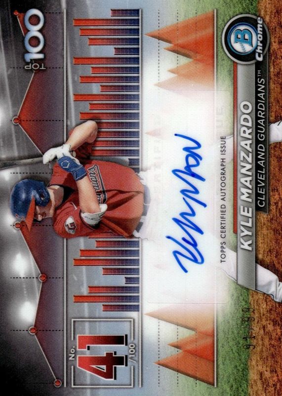This card is 1 of 4 Kyle Manzardo's card variations in the 2024 Bowman set being tracked by Sports Card Investor, including Bowman Scouts' Top 100 Autographs - Gold Refractor /50, Bowman Scouts' Top 100 Autographs - Red Refractor /5, and Bowman Scouts' Top 100 Autographs - Superfractor /1.