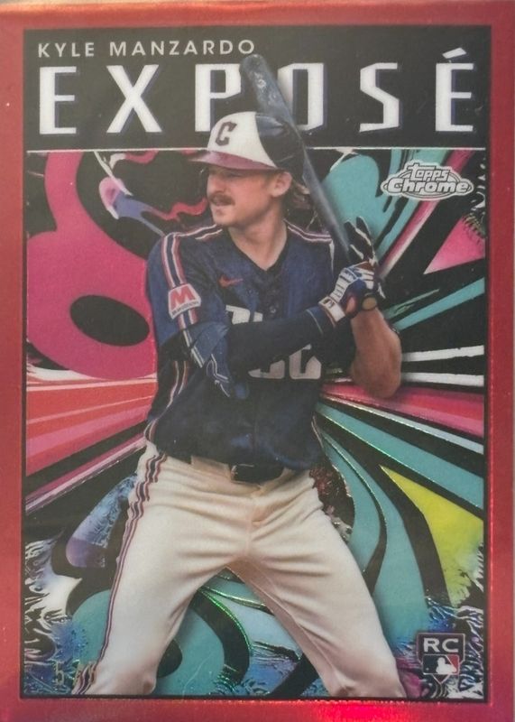The Kyle Manzardo 2024 Topps Chrome Update #TCE-49 Expose - Red Refractor /5 Rookie card in Raw condition has not changed in price in the last 30 days and was last sold for $1,100.00 .