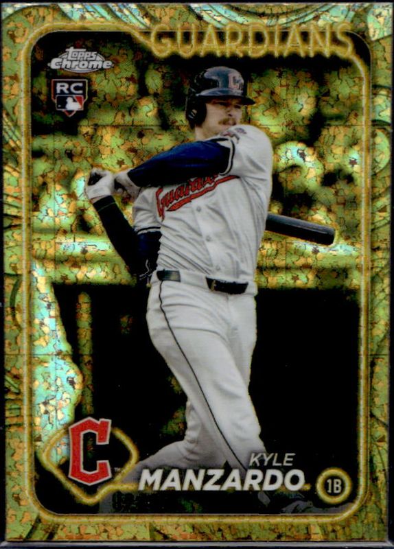 The Kyle Manzardo 2024 Topps Gilded Collection #15 Mini-Diamond Refractor /50 Rookie card is 1 of 7 Kyle Manzardo's card variations in the 2024 Topps Gilded Collection set being tracked by Sports Card Investor, including Base /99, Gold Wave Refractor /75, Gold RayWave Refractor /25, Gold Lava Refractor /10, and Electroplate Refractor /5.