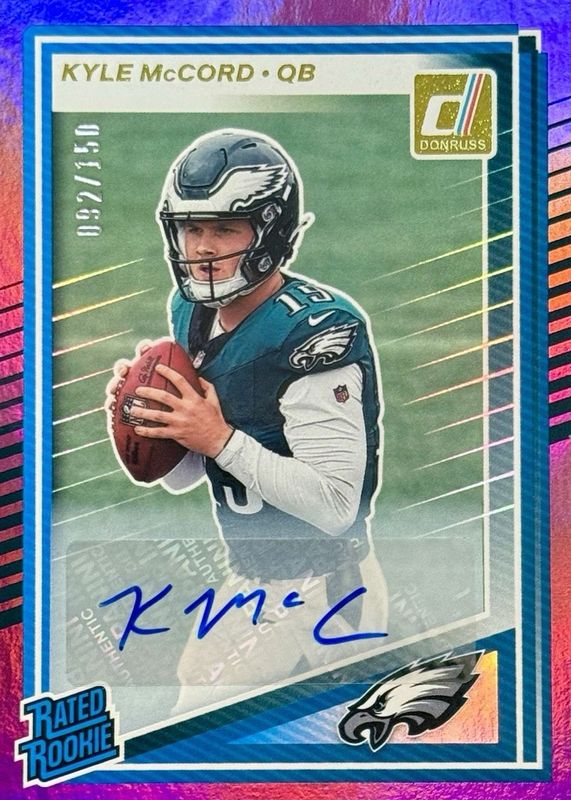 The Kyle McCord 2025 Donruss #325 Rated Rookie Autographs - Blue /150 card in Raw condition has not changed in price in the last 30 days and was last sold for $15.00 .