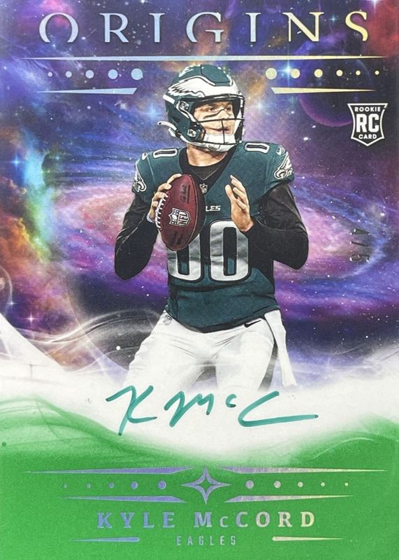 This card is 1 of 18 Kyle McCord's card variations in the 2025 Origins set being tracked by Sports Card Investor, including Rookie Autographs, Rookie Jumbo Patch Autographs, Rookie Autographs - Red /99, Rookie Jumbo Patch Autographs - Red /99, and Rookie Autographs - Orange /75.
