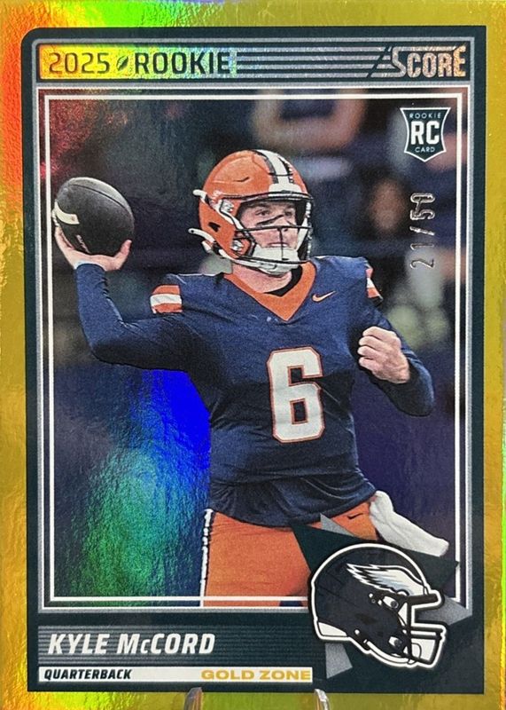 The Kyle McCord 2025 Score #73 Gold Zone /50 Rookie card in Raw condition has not changed in price in the last 30 days and was last sold for $7.40 .