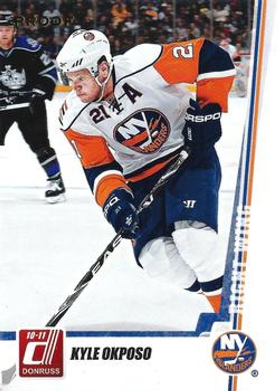 The Kyle Okposo 2010 Donruss #75 Press Proofs /100 card is 1 of 3 Kyle Okposo's card variations in the 2010 Donruss set being tracked by Sports Card Investor, including Base, and die-cut Gems /30.