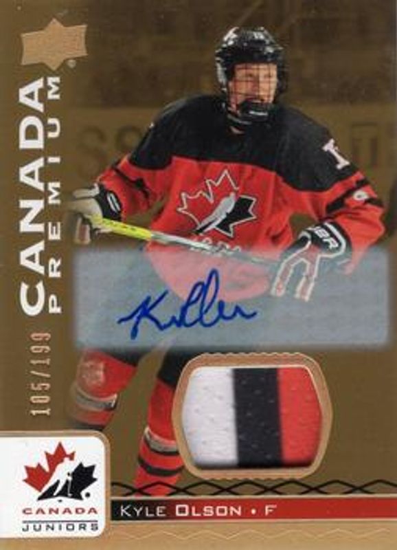 The Kyle Olson 2017 Upper Deck Team Canada Juniors #45 Premium Materials Autographs /199 card is 1 of 11 Kyle Olson's card variations in the 2017 Upper Deck Team Canada Juniors set being tracked by Sports Card Investor, including Base, Blue Spectrum, Red Exclusives /199, High Gloss /25, and Black Parallel /5.