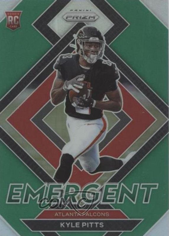The Kyle Pitts 2021 Prizm #E-11 Emergent - Green Rookie card in Raw condition has not changed in price in the last 30 days and was last sold for $3.42 .