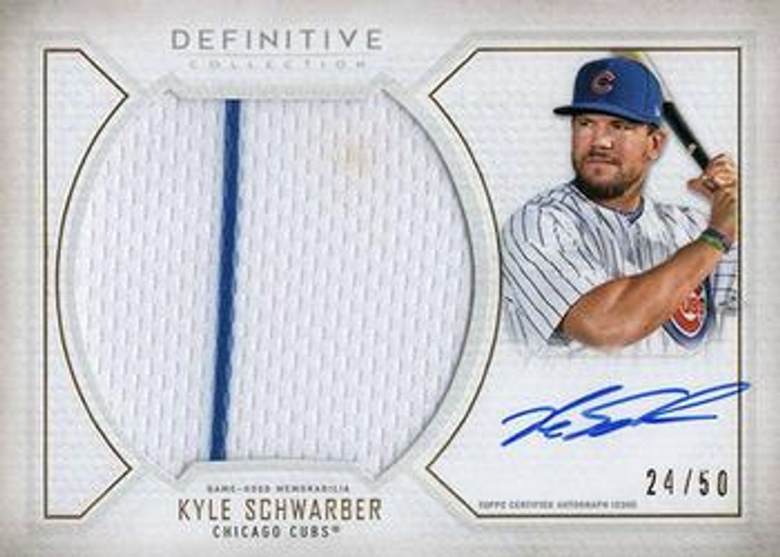 The Kyle Schwarber 2019 Topps Definitive Collection #ARC-KS Base /50 card is 1 of 19 Kyle Schwarber's card variations in the 2019 Topps Definitive Collection set being tracked by Sports Card Investor, including Green /25, Purple /10, Red Jersey Button /1, Red Laundry Tag /1, and Red Majestic Logo /1.