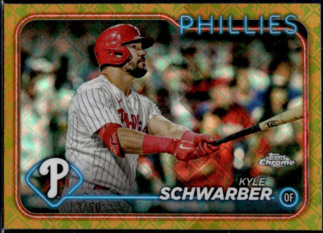 The Kyle Schwarber 2024 Topps Chrome Logofractor Edition #71 Gold /50 card is 1 of 10 Kyle Schwarber's card variations in the 2024 Topps Chrome Logofractor Edition set being tracked by Sports Card Investor, including Base, Purple /250, Aqua /199, Blue /150, and Green /99.