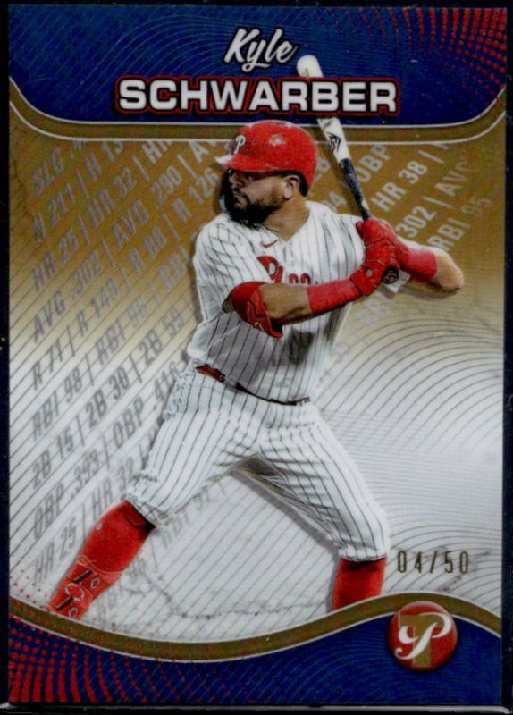 The Kyle Schwarber 2024 Topps Pristine #PP-12 Pristine Production - Gold Refractor /50 card is 1 of 35 Kyle Schwarber's card variations in the 2024 Topps Pristine set being tracked by Sports Card Investor, including Base, Pristine Refractor, Refractor, Green Refractor /150, and Pristine Purple Refractor /99.