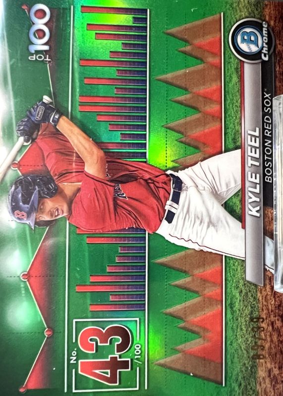 The Kyle Teel 2024 Bowman #BTP-43 Bowman Scouts' Top 100 - Green Refractor /99 card in Raw condition has not changed in price in the last 30 days and was last sold for $5.50 .