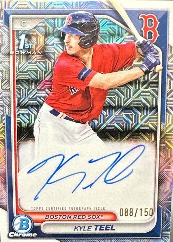 The Kyle Teel 2024 Bowman #CPA-KT Chrome Prospect Auto - HTA Choice Refractor /150 (1st) card in Raw condition has not changed in price in the last 30 days and was last sold for $49.99 .