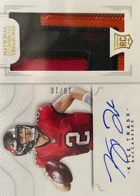 This card is 1 of 52 Kyle Trask's card variations in the 2021 National Treasures set being tracked by Sports Card Investor, including Rookie Patch Auto /99, Rookie Patch Auto - Green Jersey Number (/2), Rookie Patch Auto - Purple /49, Rookie Patch Auto - Holo Silver /25, and Rookie Patch Auto - Stars & Stripes Holo Silver /25.