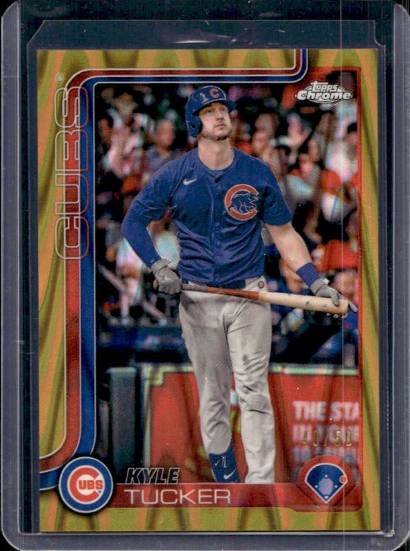 The Kyle Tucker 2025 Topps Chrome #103 Gold RayWave Refractor /50 card is 1 of 52 Kyle Tucker's card variations in the 2025 Topps Chrome set being tracked by Sports Card Investor, including Base, Geometric Refractor, Lightboard Logo Variation, Negative Refractor, and Prism Refractor.