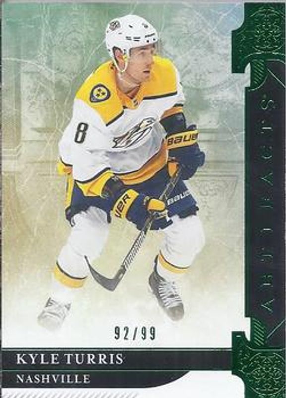 The Kyle Turris 2019 Upper Deck Artifacts #47 Emerald /99 card is 1 of 11 Kyle Turris' card variations in the 2019 Upper Deck Artifacts set being tracked by Sports Card Investor, including Base /999, Copper /299, Pink /85, Aqua /45, and Purple /20.