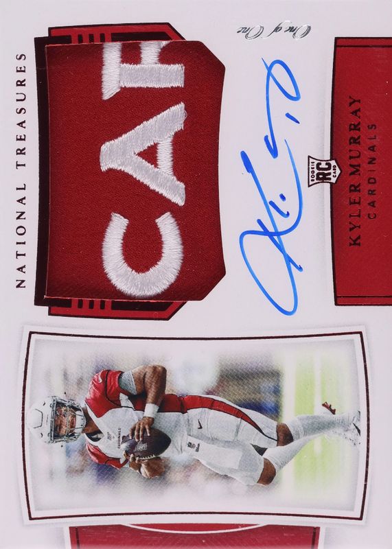 This card is 1 of 11 Kyler Murray's card variations in the 2019 National Treasures set being tracked by Sports Card Investor, including Rookie Patch Auto /99, Rookie Patch Auto - Green Jersey Number (/1), Rookie Patch Auto - Holo Silver /25, Rookie Patch Auto - Midnight /20, and Rookie Patch Auto - Holo Gold /10.