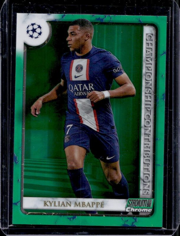 Kylian Mbappe 2022 Topps Stadium Club Chrome UEFA Club Competitions #CC-KM Championship Contributions - Green Refractor /99 RAW Price Guide