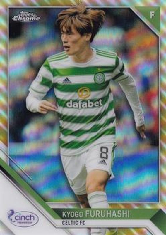 The Kyogo Furuhashi 2021 Topps Chrome SPFL #13 Gold /75 card is 1 of 18 Kyogo Furuhashi's card variations in the 2021 Topps Chrome SPFL set being tracked by Sports Card Investor, including Base, Refractor, Blue Tartan /125, Green Tartan /50, and Orange /25.
