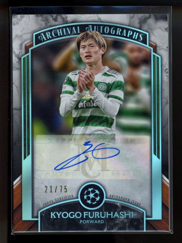 The Kyogo Furuhashi 2022 Topps Museum Collection UEFA Champions League #AA-KF Archival Autographs - Sapphire /75 card is 1 of 18 Kyogo Furuhashi's card variations in the 2022 Topps Museum Collection UEFA Champions League set being tracked by Sports Card Investor, including Archival Autographs /299, Museum Autographs Relics /299, Meaningful Material Single Relics /250, Archival Autographs - Amethyst /99, and Meaningful Material Single Relics - Amethyst /99.