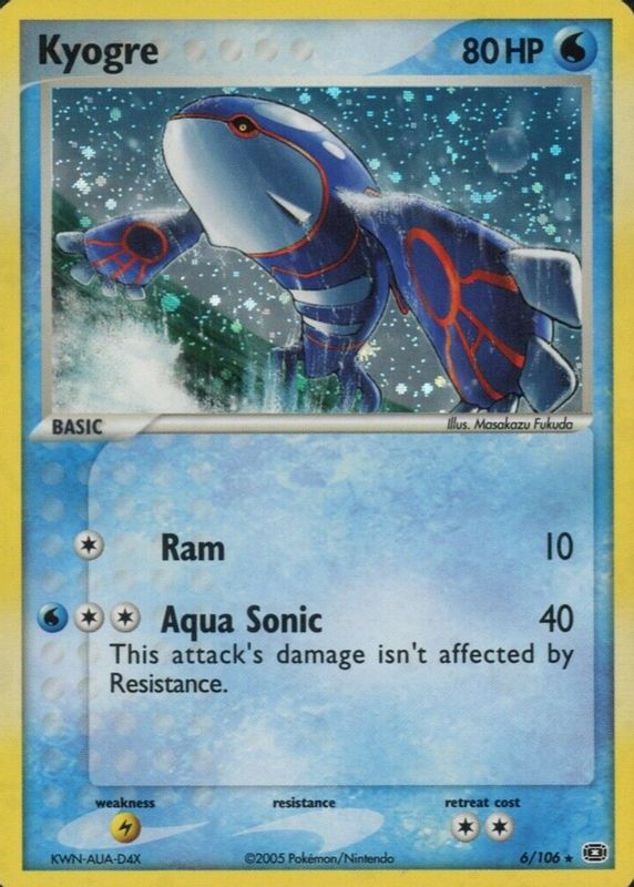 The Kyogre 2005 EX: Emerald #006/106 Holo card in Raw TCG (Near Mint) condition has moved up $19.41 (+92.4%) in the last 30 days and was last sold for $40.42 .
