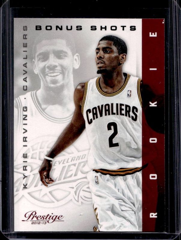 The Kyrie Irving 2012 Prestige #151 Bonus Shots Black /10 Rookie card is 1 of 10 Kyrie Irving's card variations in the 2012 Prestige set being tracked by Sports Card Investor, including Base, Bonus Shots Gold /249, Franchise Favorites, Inside the Numbers - Materials, and Prestigious Picks Signatures.