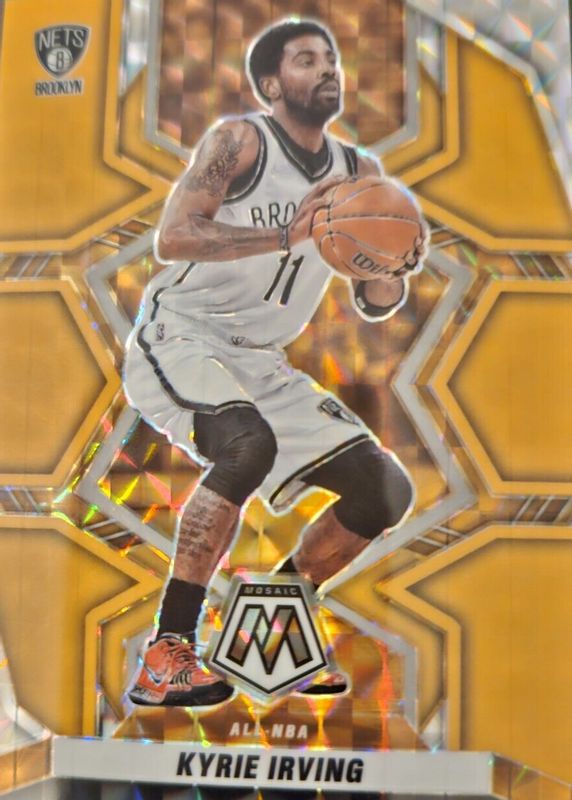 The Kyrie Irving 2021 Mosaic #295 All-NBA - Orange Fluorescent /25 card in Raw condition has not changed in price in the last 30 days and was last sold for $13.00 .