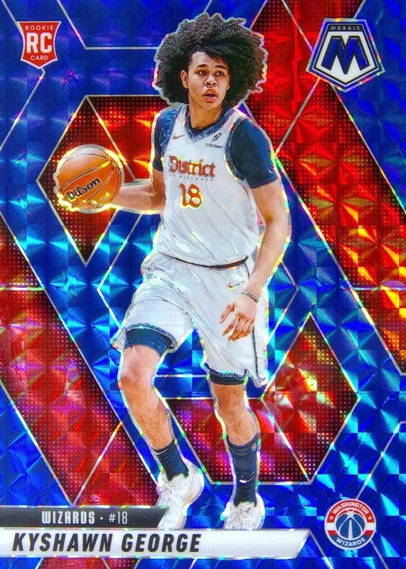 The Kyshawn George 2024 Mosaic #247 Blue /199 Rookie card in Raw condition has not changed in price in the last 30 days and was last sold for $2.50 .