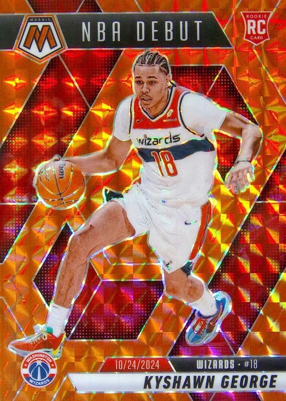 The Kyshawn George 2024 Mosaic #256 NBA Debut - Orange /249 Rookie card in Raw condition has moved up $0.26 (+8.7%) in the last 30 days and was last sold for $3.25 .