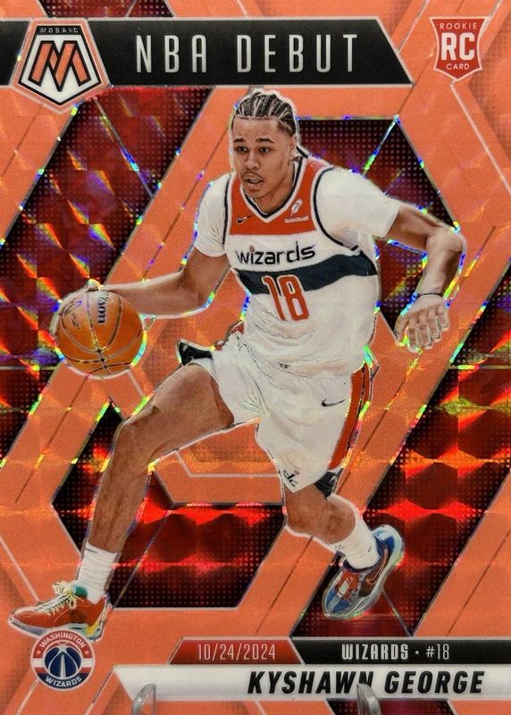 The Kyshawn George 2024 Mosaic #256 NBA Debut - Red Fluorescent /75 Rookie card in Raw condition has not changed in price in the last 30 days and was last sold for $2.25 .