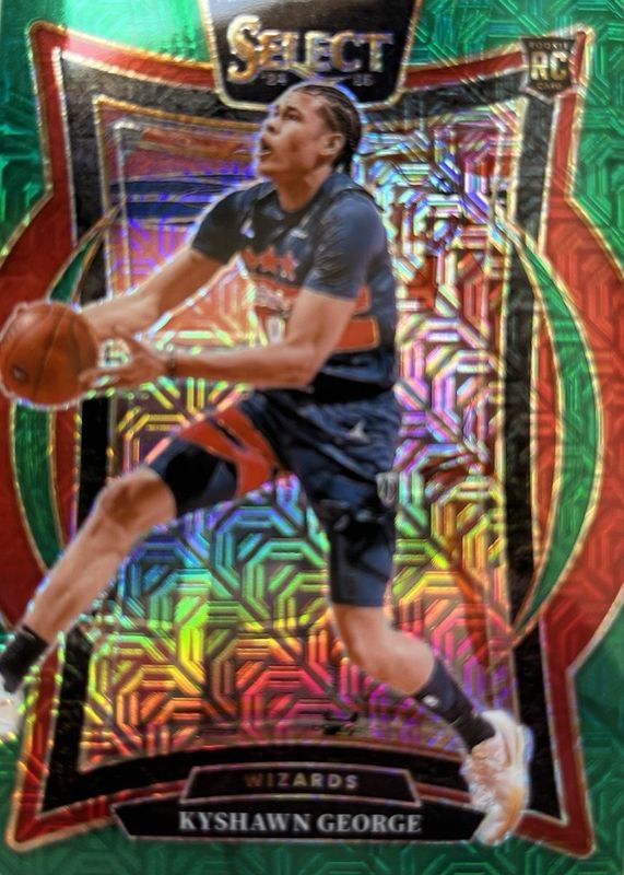 The Kyshawn George 2024 Select #85 Concourse Green Mojo Rookie card in Raw condition has not changed in price in the last 30 days and was last sold for $0.99 .