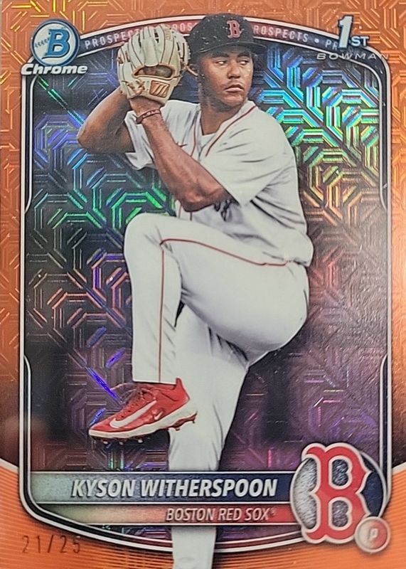 The Kyson Witherspoon 2025 Bowman Draft Mega Box #BDC-29 Chrome - Orange Mega Refractor /25 (1st) card in Raw condition has not changed in price in the last 30 days and was last sold for $100.00 .