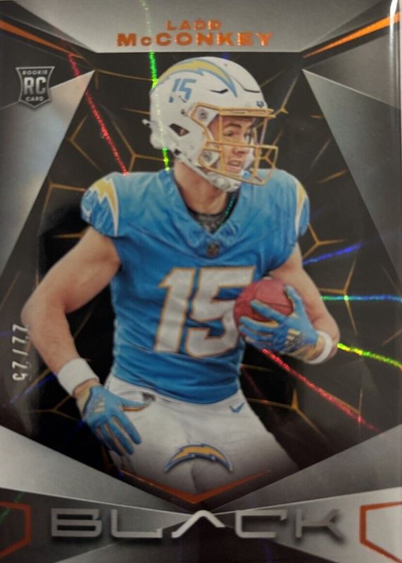 This card is 1 of 16 Ladd McConkey's card variations in the 2024 Black set being tracked by Sports Card Investor, including Base, Royal /99, Sapphire /35, Emerald /15, and Gold /10.