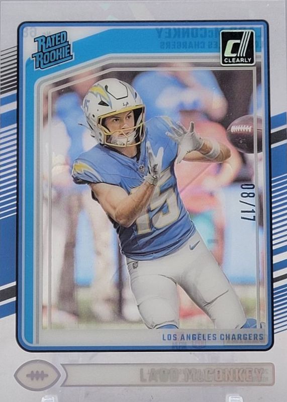 The Ladd McConkey 2024 Clearly Donruss #68 Ice /17 Rookie card in Raw condition has not changed in price in the last 30 days and was last sold for $32.13 .