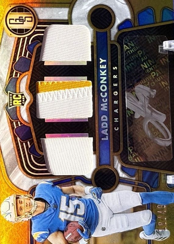 The Ladd McConkey 2024 Gold Standard #210 Rookie Jersey Autographs - White Gold /49 card in Raw condition has not changed in price in the last 30 days and was last sold for $39.07 .