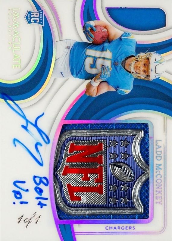 The Ladd McConkey 2024 Immaculate #PPRA-LMY Premium Patch Rookie Autographs - NFL Shield /1 card in Raw condition has not changed in price in the last 30 days and was last sold for $1,913.00 .