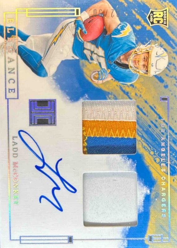 The Ladd McConkey 2024 Impeccable #RHP-LMY Elegance Rookie Autographs - Helmet & Patch Silver /50 card in Raw condition has not changed in price in the last 30 days and was last sold for $53.00 .