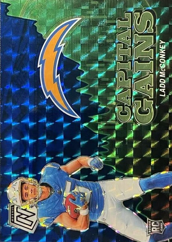 The Ladd McConkey 2024 Mosaic #13 Capital Gains - Blue /99 Rookie card in Raw condition has not changed in price in the last 30 days and was last sold for $6.49 .