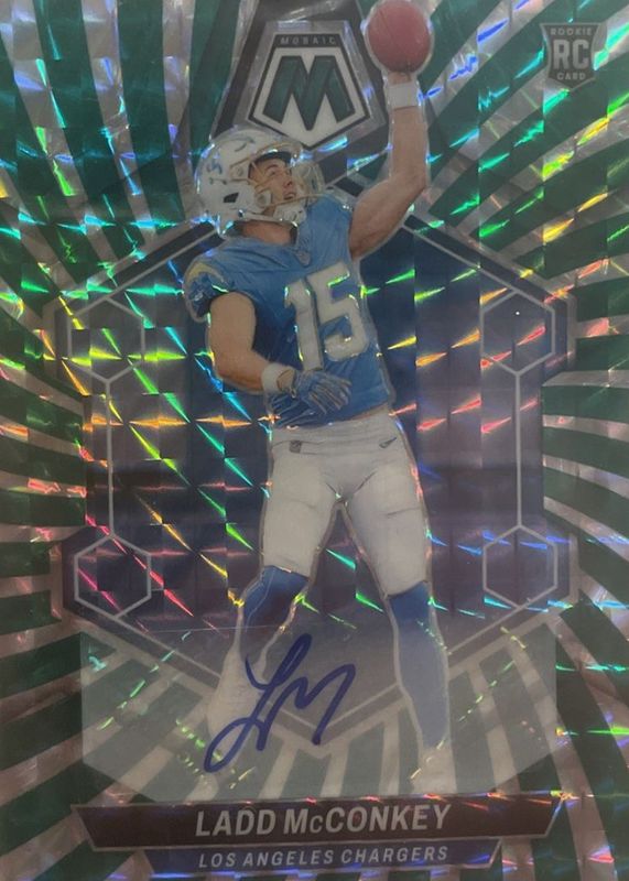 The Ladd McConkey 2024 Mosaic #334 Rookie Autographs - Green Swirl /15 card in Raw condition has not changed in price in the last 30 days and was last sold for $380.00 .