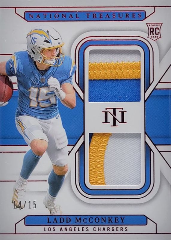 The Ladd McConkey 2024 National Treasures #RDM-LMY Rookie Dual Materials - Red Jersey Number (/15) card in Raw condition has not changed in price in the last 30 days and was last sold for $47.00 .
