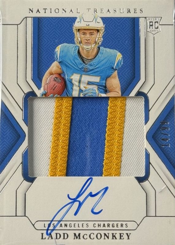 The Ladd McConkey 2024 National Treasures #165 Rookie Patch Auto /99 card in Raw condition has not changed in price in the last 30 days and was last sold for $107.50 .