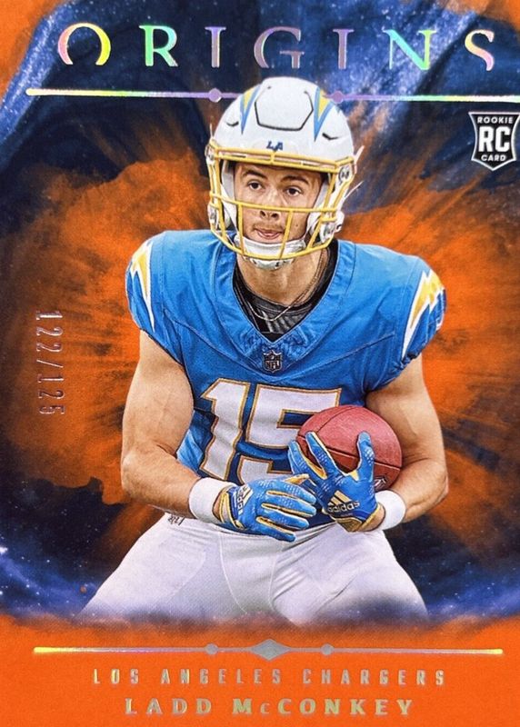 This card is 1 of 23 Ladd McConkey's card variations in the 2024 Origins set being tracked by Sports Card Investor, including Base, Holo Red /299, Red /149, Orange /125, and Blue /99.