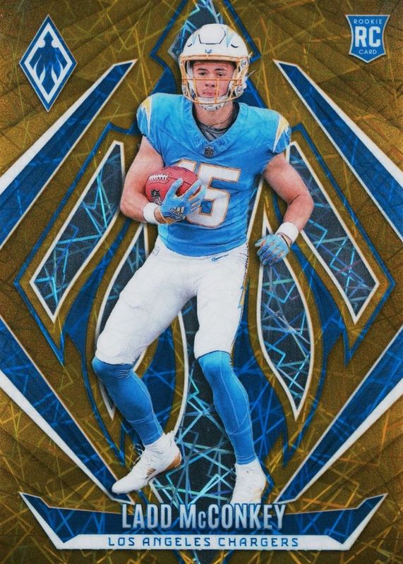 The Ladd McConkey 2024 Phoenix #216 Gold Lazer /10 Rookie card in Raw condition has not changed in price in the last 30 days and was last sold for $52.00 .