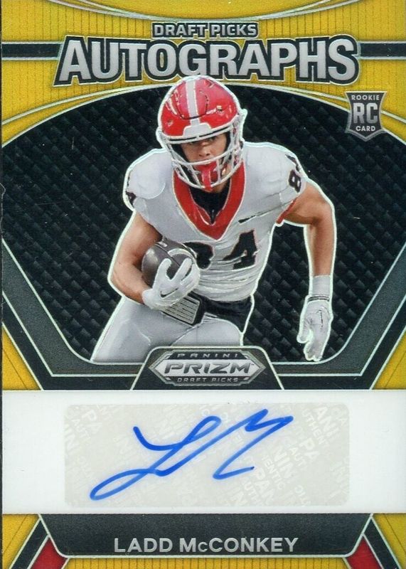 The Ladd McConkey 2024 Prizm Draft Picks #DPA-LMY Draft Picks Autographs - Gold /10 Rookie card in Raw condition has not changed in price in the last 30 days and was last sold for $73.00 .