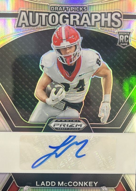 The Ladd McConkey 2024 Prizm Draft Picks #DPA-LMY Draft Picks Autographs - Silver Rookie card in Raw condition has not changed in price in the last 30 days and was last sold for $19.50 .