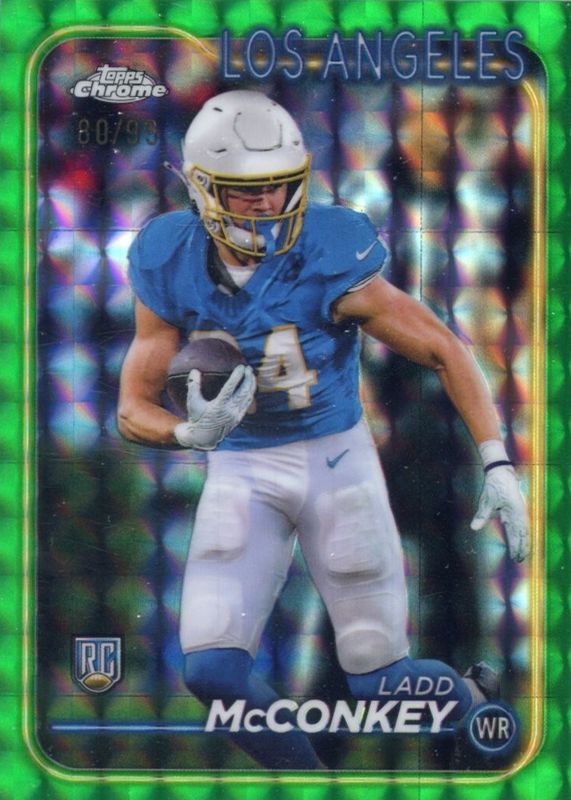 The Ladd McConkey 2024 Topps Chrome #212 Green Geometric Refractor /99 Rookie card in Raw condition has not changed in price in the last 30 days and was last sold for $6.50 .