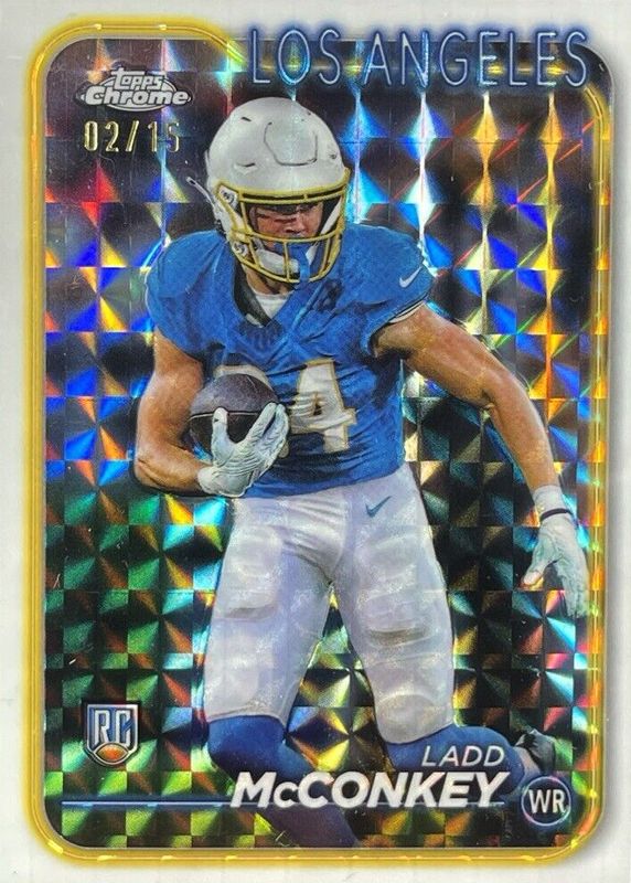 The Ladd McConkey 2024 Topps Chrome #212 White Geometric Refractor /15 Rookie card in Raw condition has not changed in price in the last 30 days and was last sold for $74.99 .